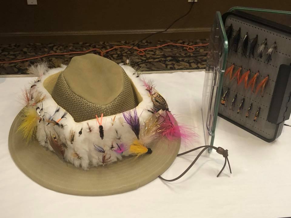 ; rod and reel carriers; 2020 Invitational Fly Plate; Atlantic Salmon Fly Plate; 3-night stay bay-front condo, Newport, OR; 1-day hosted drift boat trip; fishing waders, boots, vests, backpacks & wading staff; fly fishing books, DVDs & VHS tapes; assorted hand-tied flies; fly tying kits & tools; portable fly tying tables; art items; delicious cake by Laura; magnification binoculars; fly fishing apparel & sports wear;  and micro water filter system.